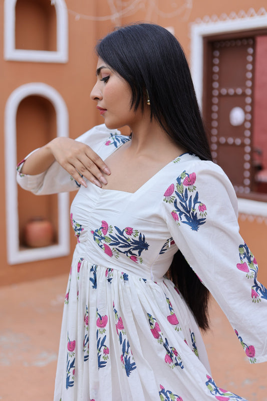 Yellow and White Puff Sleeves High Slit Cutout Dress