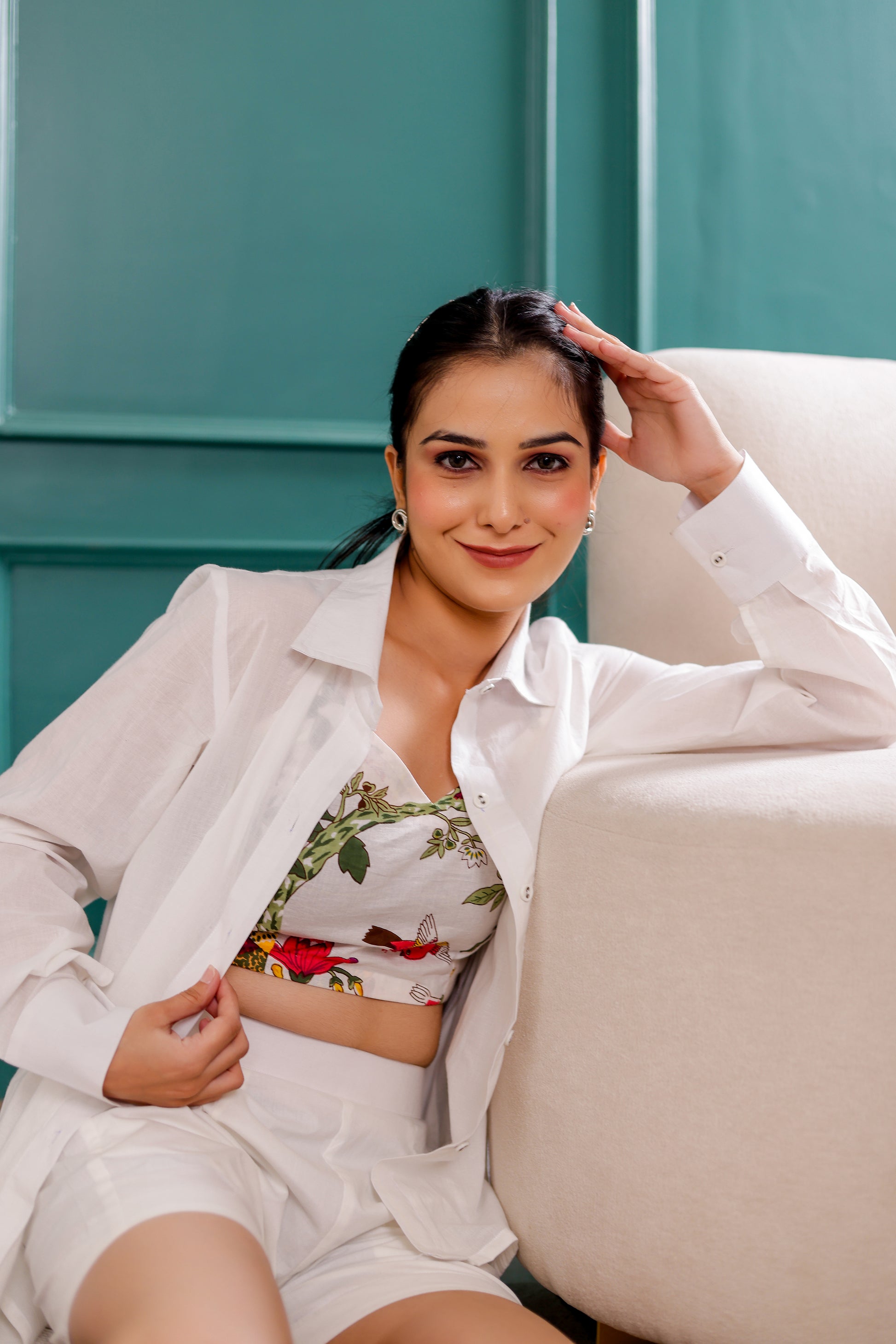 | Maintain relaxed style & comfort in this three-piece co-ord set in pure cotton fabric. The set has a solid white colored shorts with open collared buttoned shirt.ensembled with a printed bralette without pads to elevate the look. |